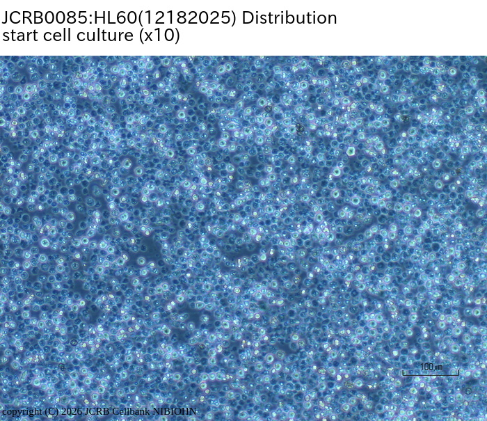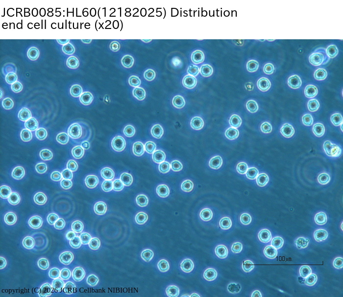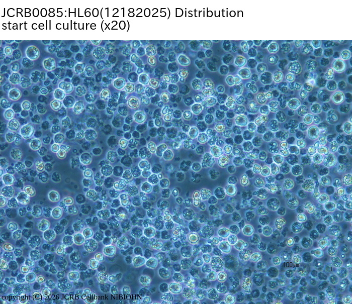 | 分譲時制限 | free | コメント | Doubling time is 40hr. Growth is not so good from thawing to 1 month. Inoculate about 10^6 cells to 60mm dish when thawing. STR-PCR indicated the HL60 is same as HL60(S) (JCRB0163), |