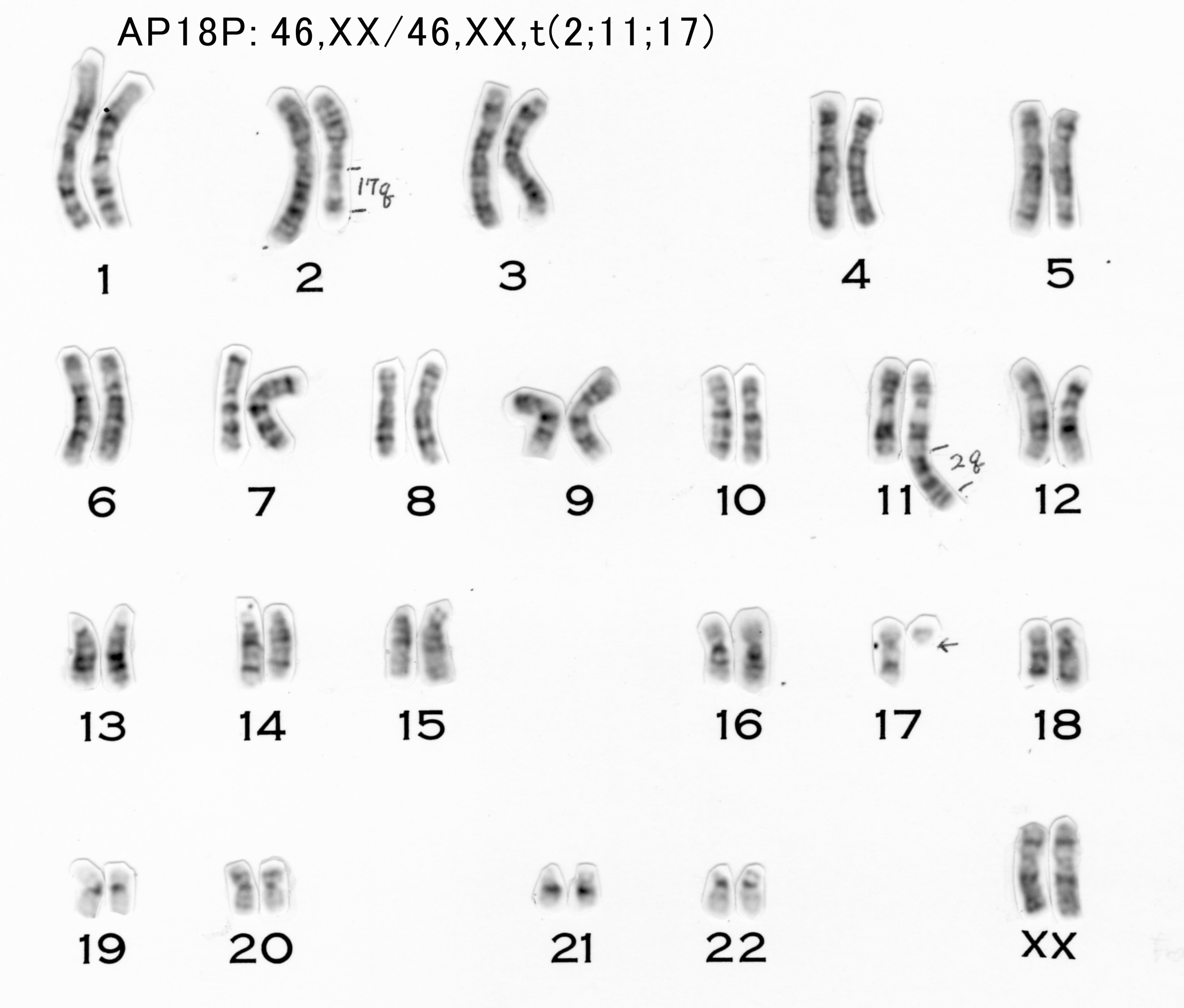 | 遺伝的性質 | MMC sensitive(lymphocyte), Karyotype=46,XX/46,XX,t(2;11;17) (lymphocyte) | 細胞寿命 | |