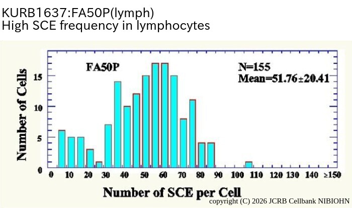 | コメント(日本語) | 臨床的にファンコニ貧血症が疑われた患者由来, PHA添加培養全血細胞, MMC感受性陰性(リンパ球), 高SCE頻度(リンパ球) | プロフィール | Blood cells cultured with phytohemagglutinin(PHA-M), from patients with clinically suspected Fanconi anemia, MMC sensitivity(lymphocyte) is normal, so it is not Fanconi anemia, High SCE frequency in lymphocytes |