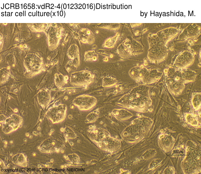 生細胞率、増殖速度、細胞濃度はバンクでのロット作製時の実測値として記していますが、保証値ではございません。また、倍加時間は継代間で計測したラフな値です。Viability/Growth rate/Cell number are represented as actual values measured at lot presentation in JCRB, but are not guaranteed values. Additionally, the doubling time is a rough value measured during passages.