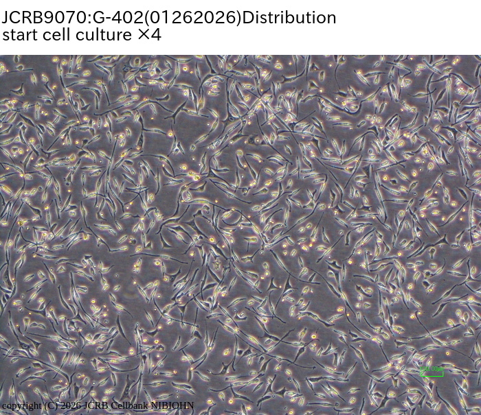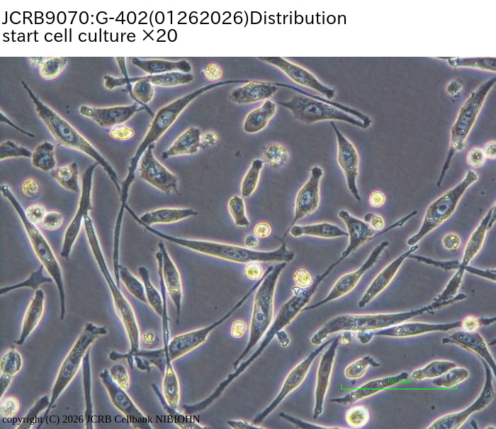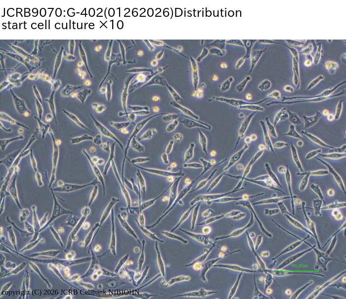 Viability/Growth rate/Cell number are represented as actual values measured at lot presentation in JCRB, but are not guaranteed values. Additionally, the doubling time is a rough value measured during passages.| Cell No. | JCRB9070 | Cell Name | G-402 |