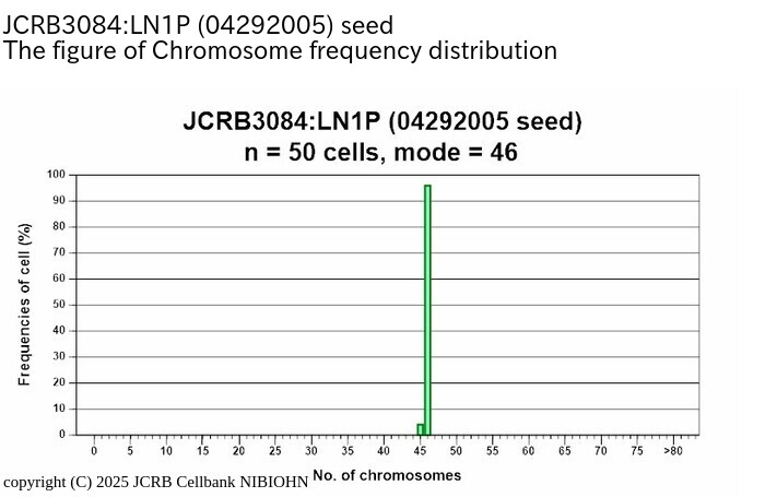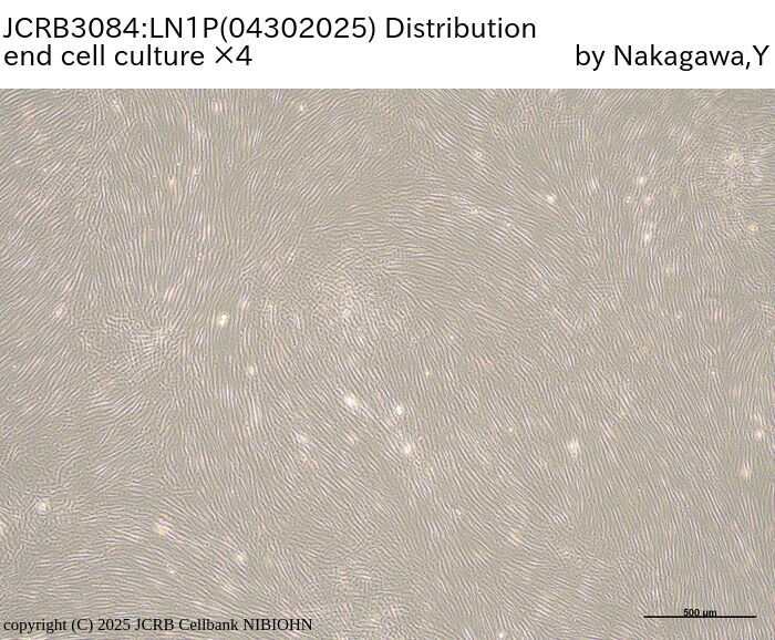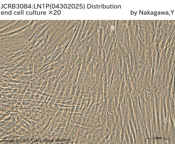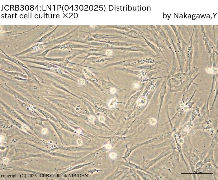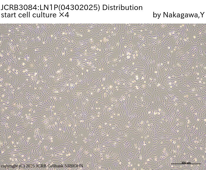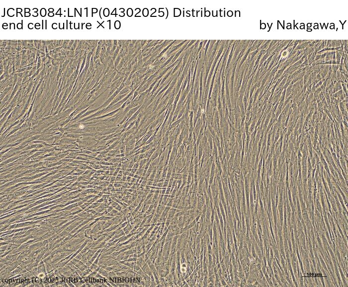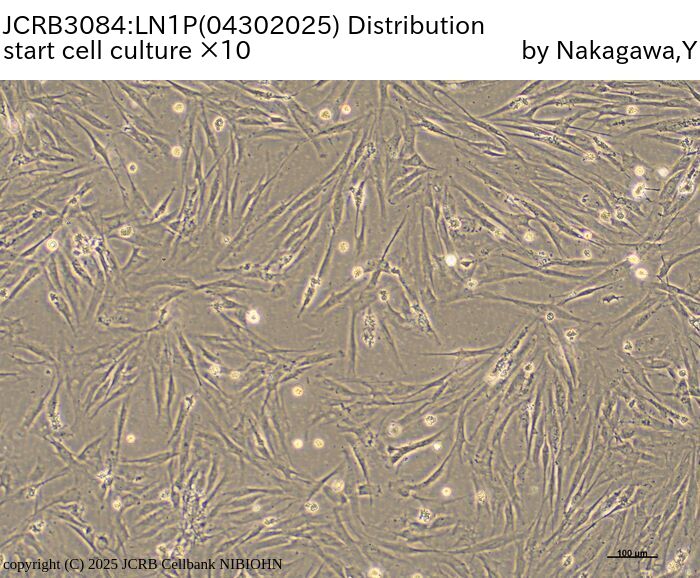 Viability/Growth rate/Cell number are represented as actual values measured at lot presentation in JCRB, but are not guaranteed values. Additionally, the doubling time is a rough value measured during passages.| Cell No. | JCRB3084 | Cell Name | LN1P |
