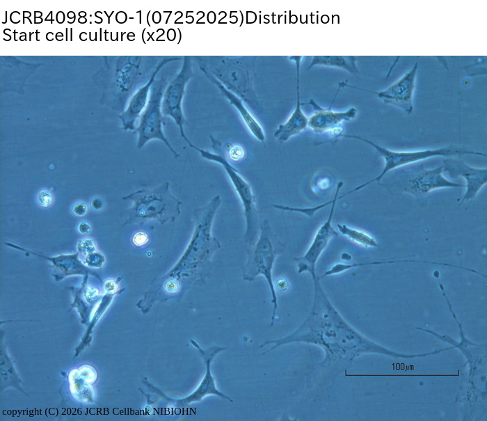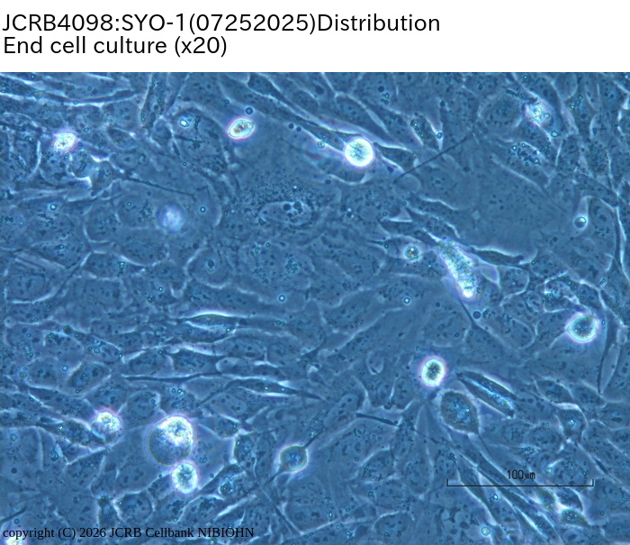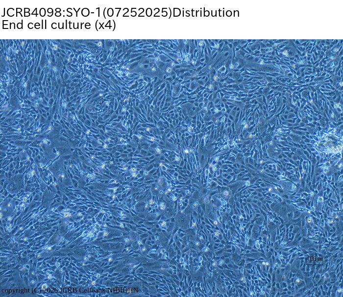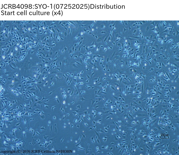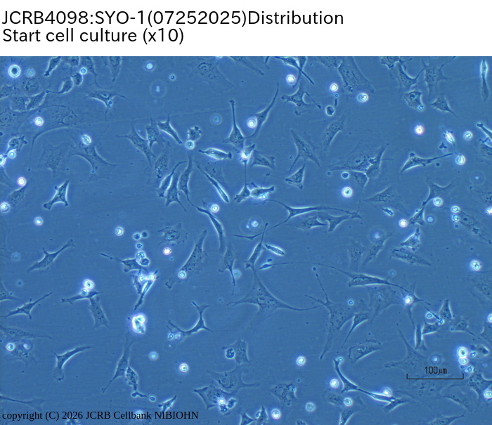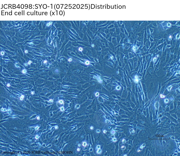 Viability/Growth rate/Cell number are represented as actual values measured at lot presentation in JCRB, but are not guaranteed values. Additionally, the doubling time is a rough value measured during passages.| Cell No. | JCRB4098 | Cell Name | SYO-1 |